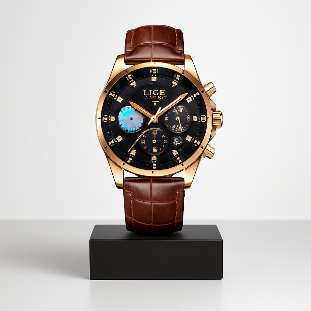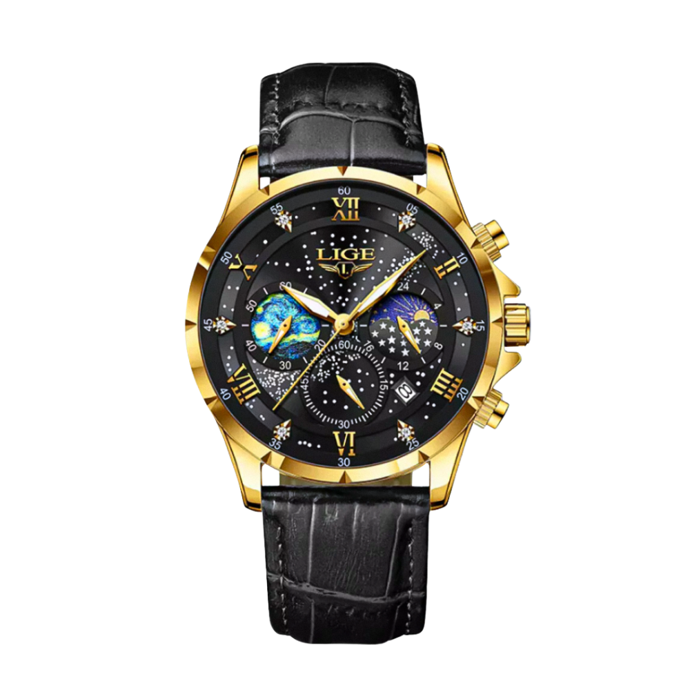 Landon | Raffineret Månefaseur på 42mm forener klassisk sofistikering med kosmisk inspiration. Perfekt til professionelle sammenhænge eller aftenudflugter, løfter dette ur dit look og tilføjer et subtilt himmelsk element med sin månefasefunktion.