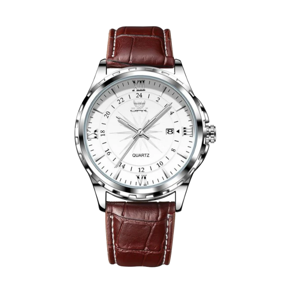 - Robust urkasse i legering med blød PU-læderrem for komfort og holdbarhed.