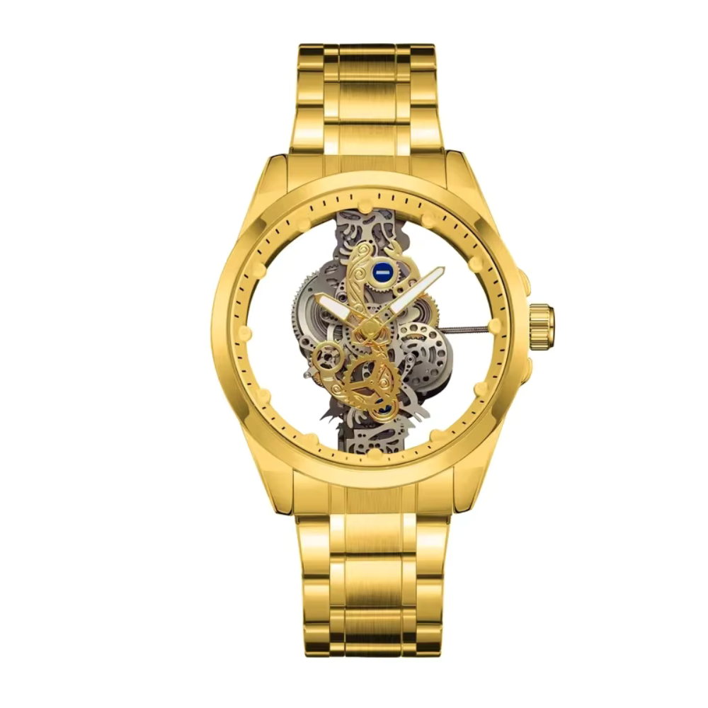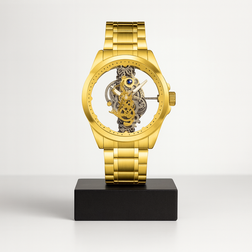 Ronan Dobbelt-sidet Skelet Kvarts Armbåndsur kombinerer et iøjnefaldende design med mekanisk elegance. Den åbne, dobbelt-sidede urskive afslører de fascinerende indre detaljer og skaber et markant statement-piece, der tiltrækker opmærksomhed. Med sit selvlysende display og elegante finish forener det håndværksmæssig finesse med moderne stil.